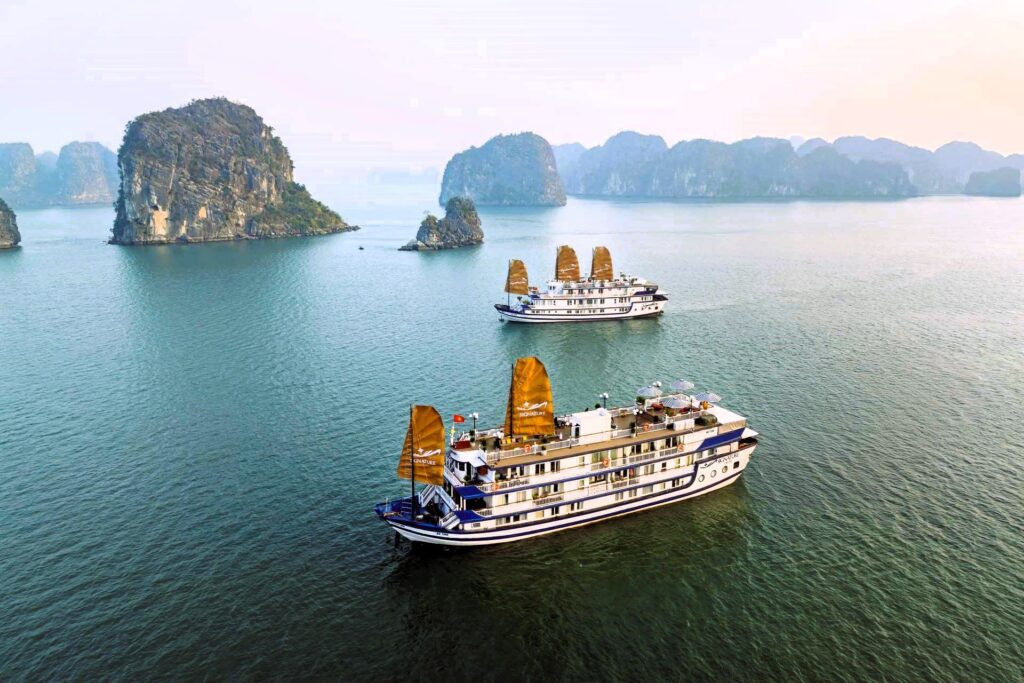 - Design et ambiance : Le navire présente une structure en bois classique inspirée des jonques vietnamiennes traditionnelles, alliée à une élégance contemporaine. Des tons chauds, des sculptures raffinées et un mobilier élégant créent une atmosphère à la fois sophistiquée et accueillante, en harmonie avec le paysage marin environnant.