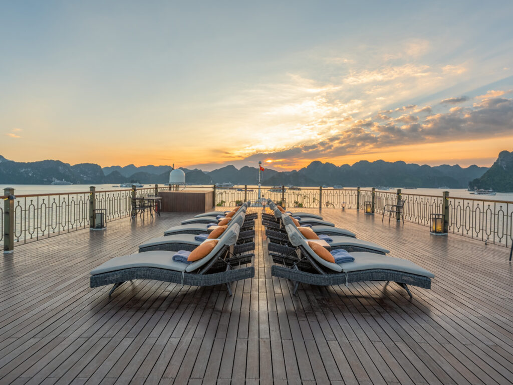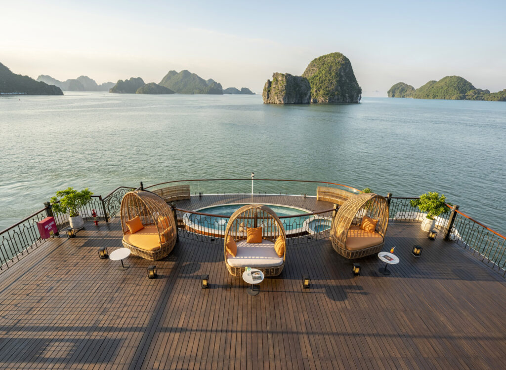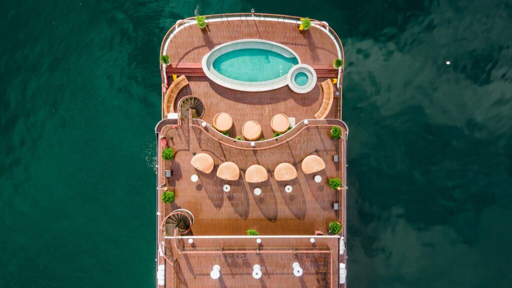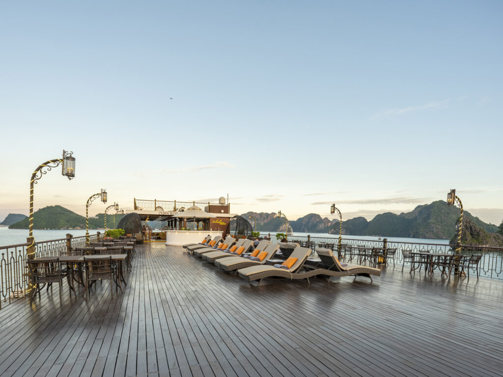 • 上层日光浴甲板(2层甲板)250平方米——非常适合瑜伽、冥想或观星 - 30平方米淡水泳池 – 下龙湾游轮上最大的凉亭之一,是游览间隙消暑的理想场所